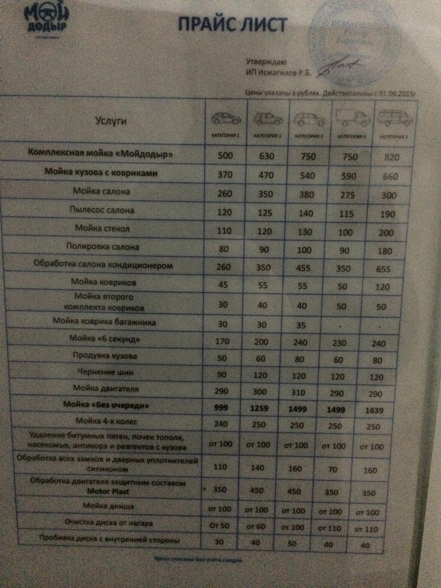 Стоимость услуг на автомойках «Мойдодыр» устанавливается в зависимости от категории автомобиля, с учетом его модели и размеров. Чтобы узнать точную стоимость услуг, выберите категорию ниже или укажите модель вашего автомобиля. Перечень услуг и цены одинаковы на всех автомойках сети.