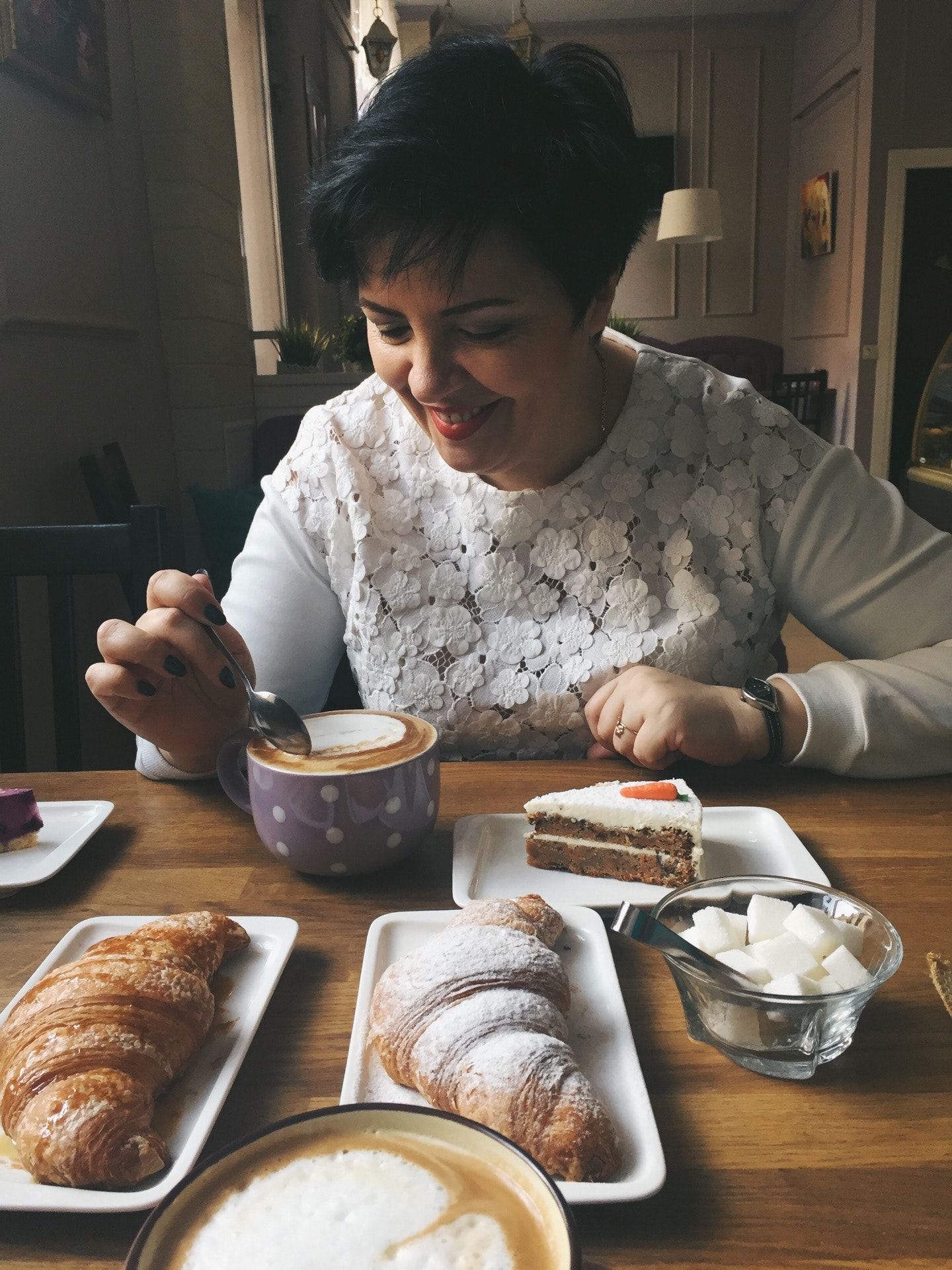 Единственный плюс - оформление. Все остальное просто отвратительно) макаруны сухие, несвежие видимо, дотронулась и они рассыпались.. Чизкейк просто 💩 круассаны с бананом - единственное, что понрав