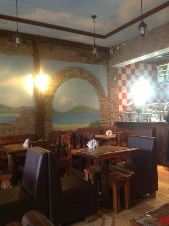 Обслуживала ну очень грубая официантка, которая не могла назвать нам фирму чая, который они заваривают в чайнике. Пицца по-американски очень жирная.